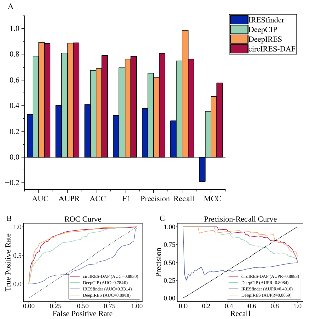 为评估模型性能,研究在独立测试集上将circIRES-DAF与现有工具(DeepCIP,IRESfinder,DeepIRES)进行了对比测试。在统一输入条件和评价标准的复现下,circIRES-DAF在 AUPR、ACC、F1-score 和 MCC 等综合指标上均取得了相对更优的结果。其中,其精确率较次优模型高出 23%,表现出较好的抗假阳性能力。此外,ROC 和 PR 曲线的结果也显示了模型在不同决策阈值下具有一定的稳健性。