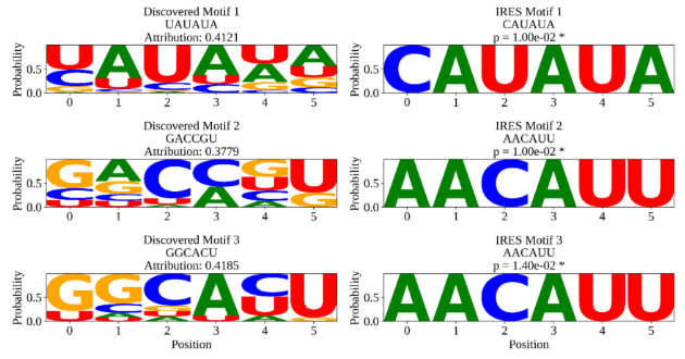 在特征分析基础上,研究利用积分梯度法识别了对模型预测贡献较大的序列片段。通过与已知IRES样元件进行显著性(p-value)比对,模型提取的 Motifs 在序列 Logo 图上呈现出与已知元件相似的组成模式,且多表现为富含腺嘌呤(A)和尿嘧啶(U)。该结果与生物学文献中关于 IRES 元件特征的报道基本一致,提示模型识别出的特征具有一定的生物学意义。