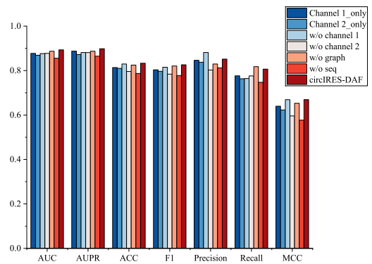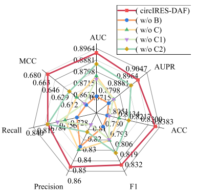 研究通过移除特定模块构建了五种变体,利用雷达图对比了各模型的性能。结果表明,完整的circIRES-DAF在AUC(0.8932)和AUPR(0.8980)等评价指标上表现相对较优。移除通道注意力机制会导致模型性能出现下降,提示了特征融合前预处理的作用。此外,未包含双重衰减融合模块(w/o C)的模型表现低于完整模型,表明相较于特征的直接拼接,自适应加权融合策略在处理异构多模态数据时具有一定的优势。