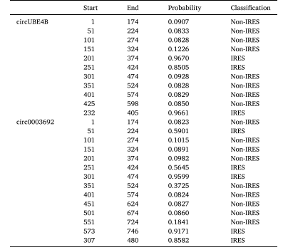 表1. 真实circRNA序列的IRES活性滑窗预测结果