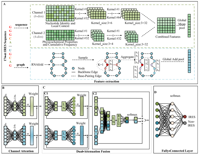 该研究提出基于双重衰减融合的深度学习框架circIRES-DAF,用于处理circRNA IRES识别中的特征融合噪声。该模型结合序列属性与空间结构特征,引入双重衰减融合机制以抑制噪声并提取关键特征。结果表明,该方法提高了IRES预测的准确性,降低了假阳性率,为分析circRNA的非帽依赖性翻译机制提供了计算辅助工具。