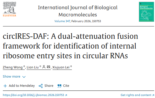 近日,陕西师范大学刘恋研究员团队在 International Journal of Biological Macromolecules 上发表最新研究成果:circIRES-DAF: A dual-attenuation fusion framework for identification of internal ribosome entry sites in circular RNAs。