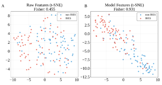 研究采用t-SNE降维技术(结合Z-score标准化与Fisher得分计算)对特征进行了可视化分析。结果显示,原始正负样本在特征空间中呈现出一定程度的重叠;而经circIRES-DAF处理后提取的特征分布中,IRES与非IRES样本形成了两个相对独立的聚类簇。该结果表明模型具备一定的特征提取与分类能力。