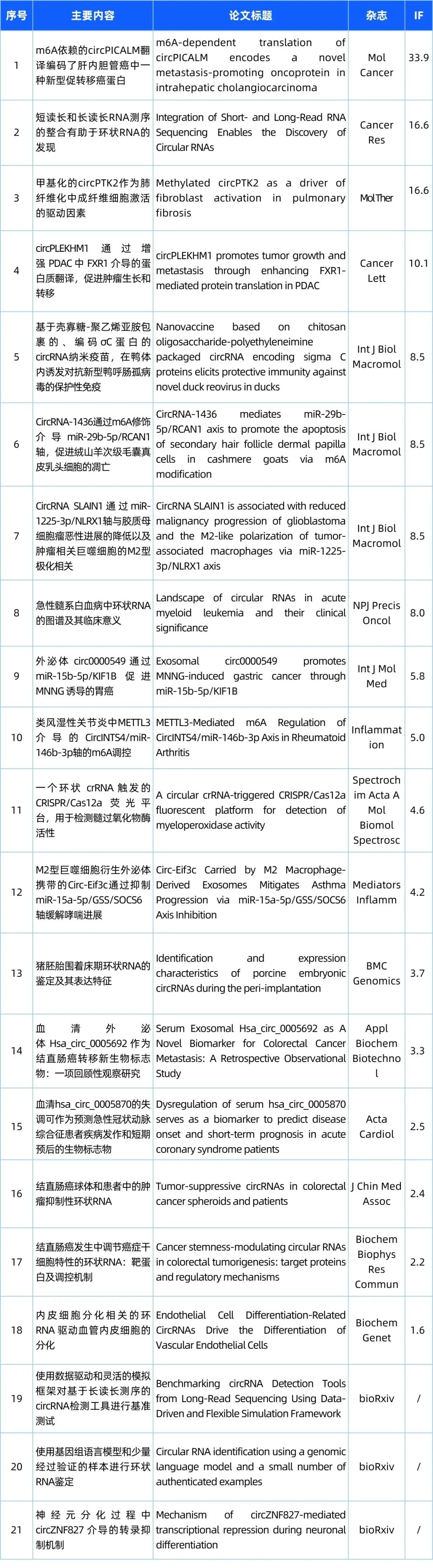 研/究/热/点 欢迎来到“circRNA研究汇总”栏目,本栏目将为您带来circRNA领域的最新研究成果。本期我们精选了21篇最新文献,涵盖了circRNA的基础研究、功能探究以及与疾病的关联。请您紧跟circRNA研究的步伐,共同洞悉科研前沿的最新动态! 检索式:(circRNA[Title/Abstract]) OR (circular RNA[Title/Abstract]) OR (circular mRNA[Title/Abstract]) 研究汇总列表 分类: 最新重要进展, 每周进展汇总admin三月 12, 2026评论