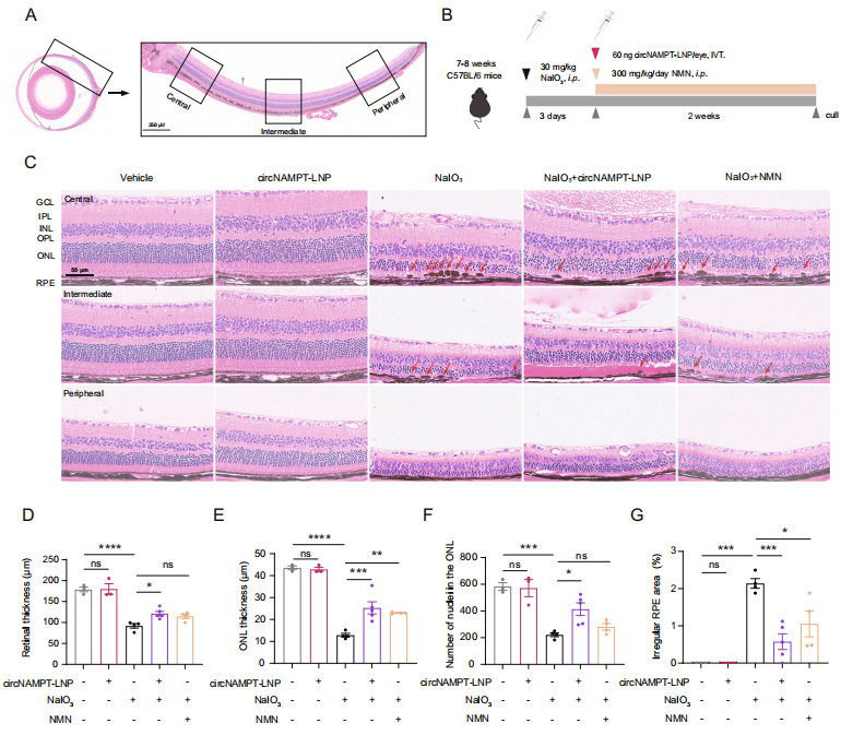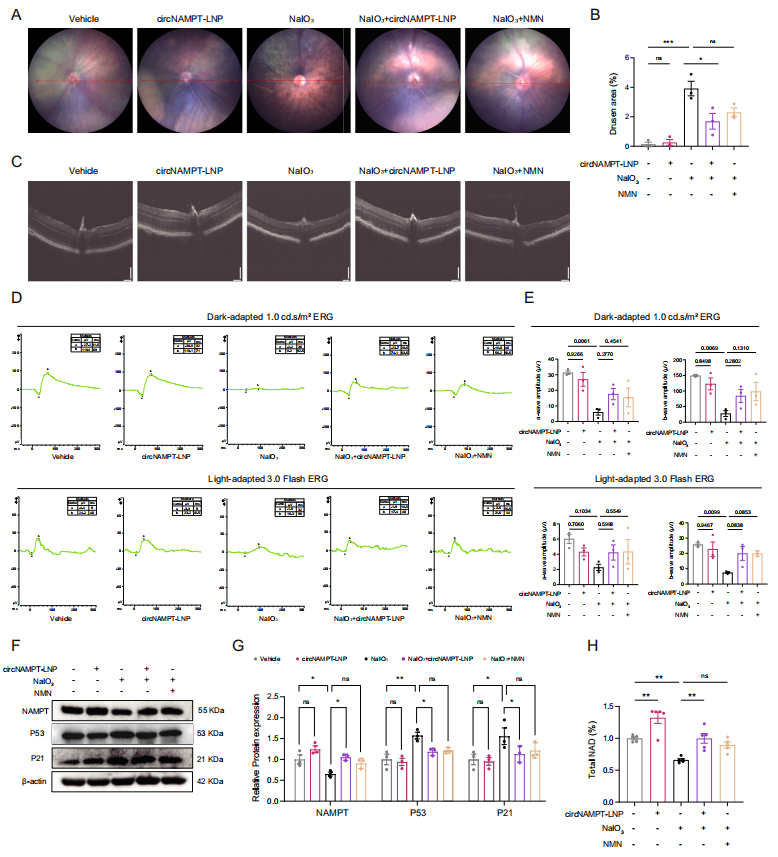 图5. CircNAMPT-LNP对碘酸钠诱导的模拟干性AMD视网膜退变具有保护作用