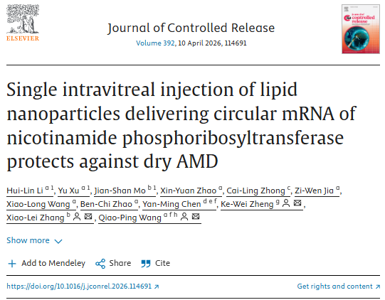 近期,中山大学张小雷教授、王巧平教授与湖南大学郑克威教授团队联合在Journal of Controlled Release发表研究论文:Single intravitreal injection of lipid nanoparticles delivering circular mRNA of nicotinamide phosphoribosyltransferase protects against dry AMD。