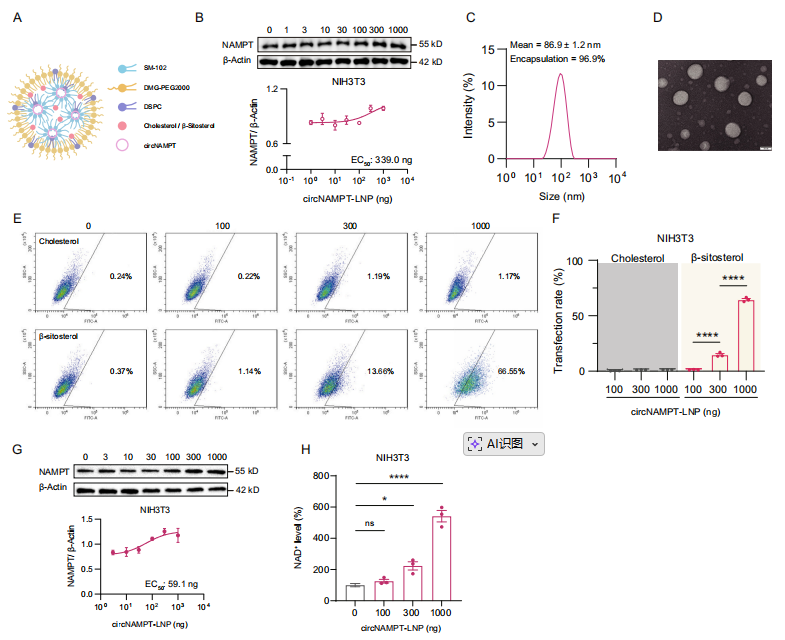 高效递送是核酸药物发挥作用的关键。研究用植物来源的β-谷甾醇替代常规配方中的胆固醇。表征结果显示,优化后的LNP-circNAMPT粒径约为86.9nm,包封率达96.9%,形态均一接近球形。体外实验证实,相比传统胆固LNP,优化体系显著提升了视网膜相关细胞的摄取率及NAMPT翻译效率,且在有效剂量下无明显细胞毒性。