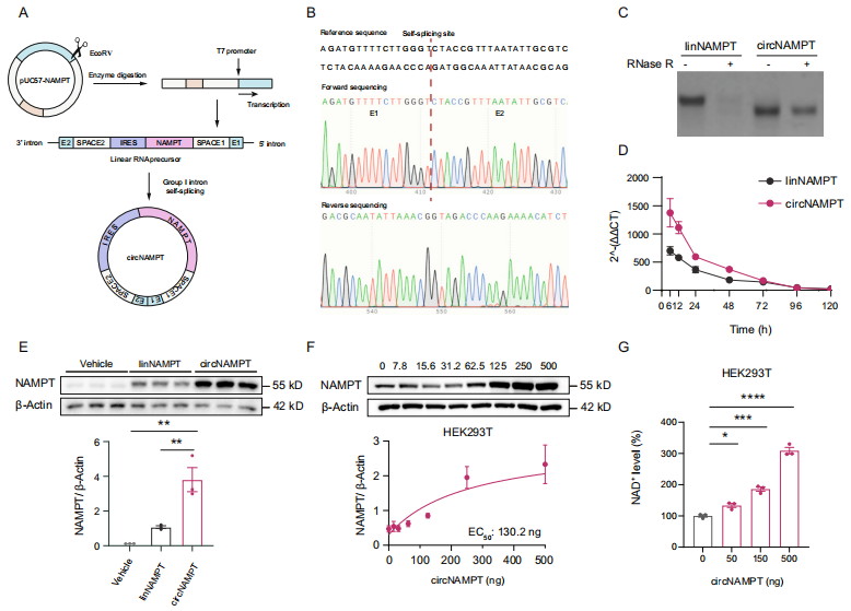研究通过PIE自剪接系统合成编码NAMPT的circRNA。RNaseR消化实验证实其首尾闭合的结构具有高度抗核酸外切酶降解能力。在体外细胞验证中,circNAMPT介导的蛋白表达与NAD+提升效果显著优于传统的线性mRNA组,且炎症因子检测显示其未引起明显免疫激活,具有较低的免疫原性。
