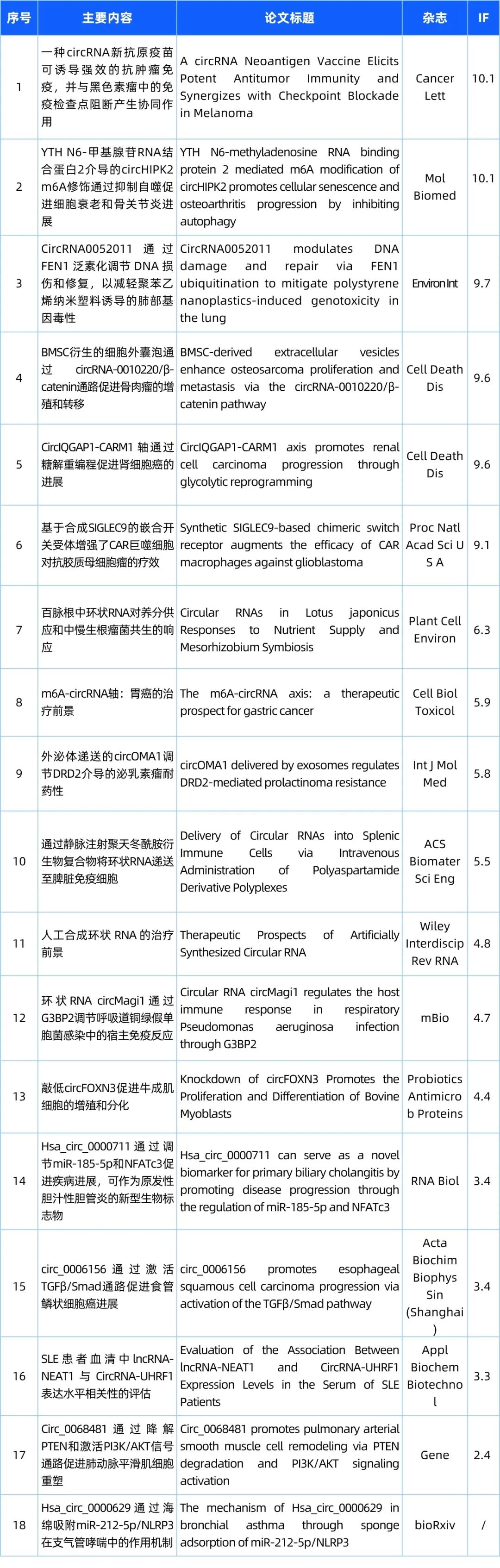 研/究/热/点 欢迎来到“circRNA研究汇总”栏目,本栏目将为您带来circRNA领域的最新研究成果。本期我们精选了18篇最新文献,涵盖了circRNA的基础研究、功能探究以及与疾病的关联。请您紧跟circRNA研究的步伐,共同洞悉科研前沿的最新动态! 检索式:(circRNA[Title/Abstract]) OR (circular RNA[Title/Abstract]) OR (circular mRNA[Title/Abstract]) 研究汇总列表 分类: 最新重要进展, 每周进展汇总admin四月 3, 2026评论