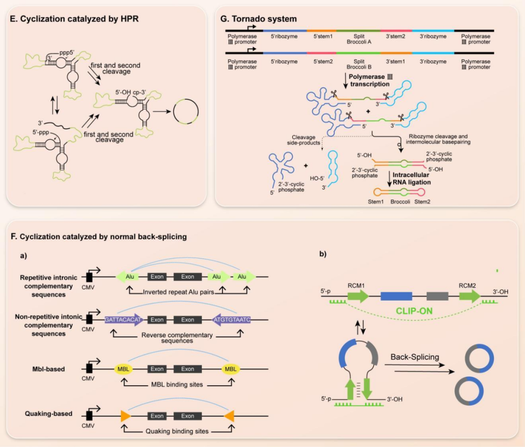 体内人工合成circRNA主要基于两类机制:一是过程依赖型(涉及内含子剪接或切割后由连接酶介导);二是发生依赖型(包括正常与异常反向剪接)。受tRNA/rRNA成熟启发的方法依赖体内内切酶切割及内源性连接酶(如RtcB)催化成环。代表性技术如Tornado系统,利用自剪接核酶结合tRNA连接酶实现高效环化。此外,亦可利用类病毒或转座子结合共表达连接酶在体内高效合成。尽管体内制备产量较高,但环化效率仍受构建体序列与结构特征的影响。