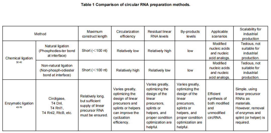 circRNA的制备是其应用的基础,但现有方法通用性有限,产率与纯度受序列结构和长度影响。短链RNA(<100 nt)多采用酶促连接,但依赖高质量线性前体;化学合成适用于短序列但成本较高,体外转录(IVT)成本较低但存在序列准确性及末端结构问题,需进一步优化。同时,生产过程中残留酶的控制及质量标准仍需完善。