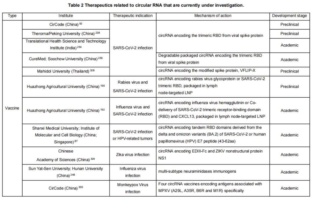 由于RNA疫苗采用无细胞制备工艺,便于规模化生产,且外源RNA本身具有一定免疫刺激作用,因此在疫苗开发中具有优势。继北京大学团队开发出新冠circRNA治疗性疫苗后,相关研究已扩展至多种传染病和肿瘤疫苗。