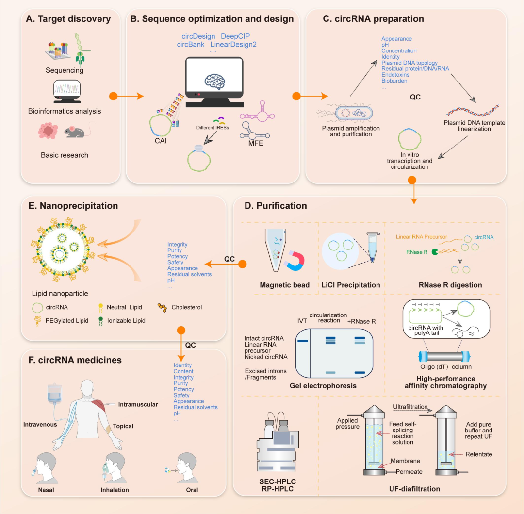 本综述全面梳理了人工合成circRNA领域的关键技术与应用进展。文章重点概述了circRNA的制备与纯化方法、序列设计与优化策略、递送技术、质量控制标准及多维应用场景。在此基础上,作者汇总了相关药物与疗法在临床前及临床阶段的研究进展,并深入剖析了该领域面临的临床转化挑战及未来发展趋势,指出科研与产业界的紧密合作将是推动circRNA疗法走向临床的关键。