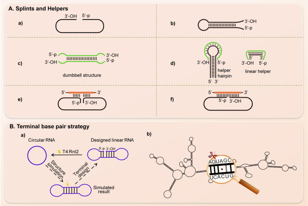 酶促连接法是大片段RNA成环的核心技术。常需引入辅助链或夹板链(Splint)来克服长链RNA折叠引发的空间位阻。常用的T4噬菌体连接酶包括:T4 DNA连接酶(Dnl)需借助DNA夹板,后续除杂繁琐;T4单链RNA连接酶(Rnl1)高度依赖夹板或底物自身折叠;而T4双链RNA连接酶(Rnl2)在双链缺口处催化效率极高(达Rnl1的50-1000倍),除兼容DNA夹板外,仅凭底物末端极短互补序列(如4 bp)即可成环,为“无夹板(Splint-free)”的通用型circRNA规模化制备奠定了基础。