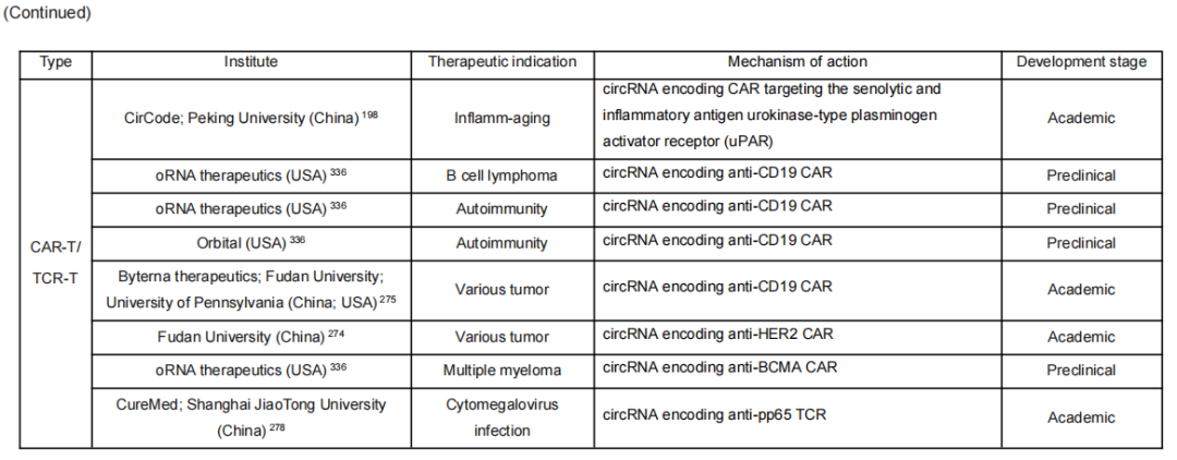 同时,多种技术平台正在开发中。例如,oRNA Therapeutics的panCAR™平台结合circRNA与LNP递送,用于在体内生成CAR-T、CAR-NK和CAR-M细胞;Circio的circVec平台可延长RNA稳定性并提高蛋白表达,目前正用于肌营养不良、心肌病及免疫治疗等方向的临床前研究。