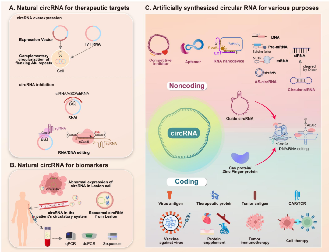 天然circRNA在临床转化中极具价值:既可作为体液无创液体活检(LB)的生物标志物,也可作为疾病干预的治疗靶点(如通过外源递送实现过表达,或借助RNAi、CRISPR等技术进行靶向抑制)。同时,人工合成circRNA在预防与治疗性疫苗、蛋白质替代疗法(PRT)、肿瘤免疫(如CAR-T、TCR-T、肿瘤疫苗)、基因编辑、表观遗传调控及生物传感器等前沿领域展现出广阔的应用前景。