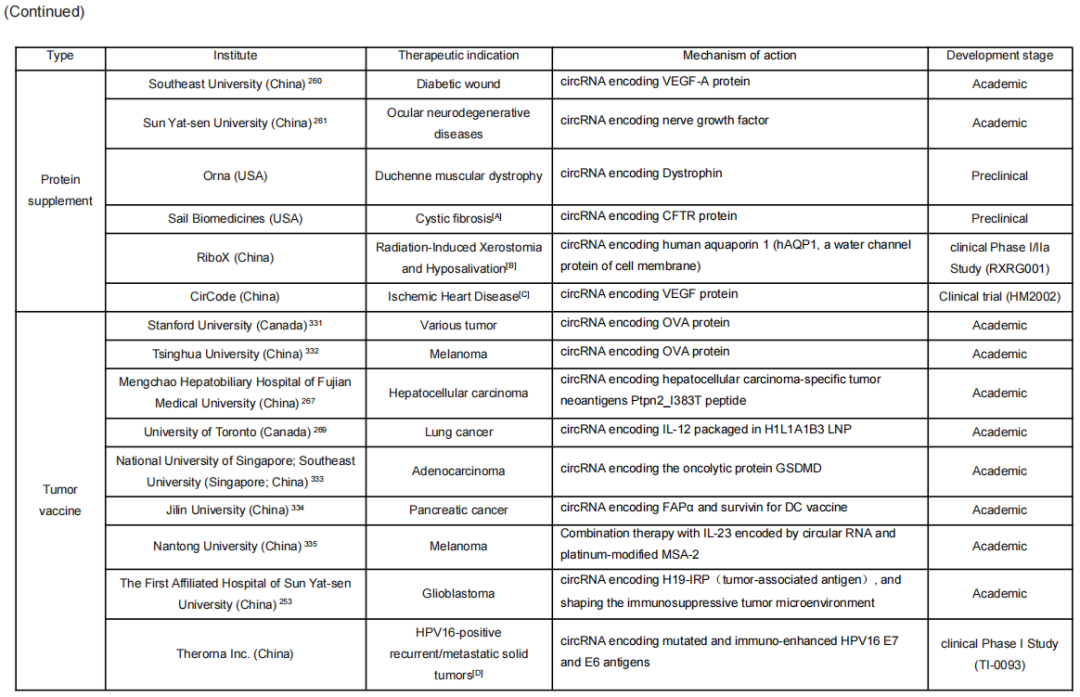 circRNA疗法已进入临床研究阶段,其中PRT进展较快。目前,RXRG001和HM2002已完成IND并进入临床试验,治疗性疫苗TI-0093的IND申请亦已获受理,表明相关药物研发正逐步推进。