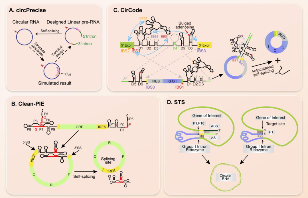 然而,PIE技术在短链(<100 nt)合成中产率受限。为弥补这一不足并提升序列精度,行业内开发了多种新型核酶催化策略,包括自我靶向剪接法(STS)、发夹核酶法、顺式连接核酶(RzL)法,以及近期涌现的直接利用天然内含子的CIRC策略、改良的SCAP系统和基于人源tRNA的自催化RNA(acRNA)策略,进一步丰富了体外高效制备手段。