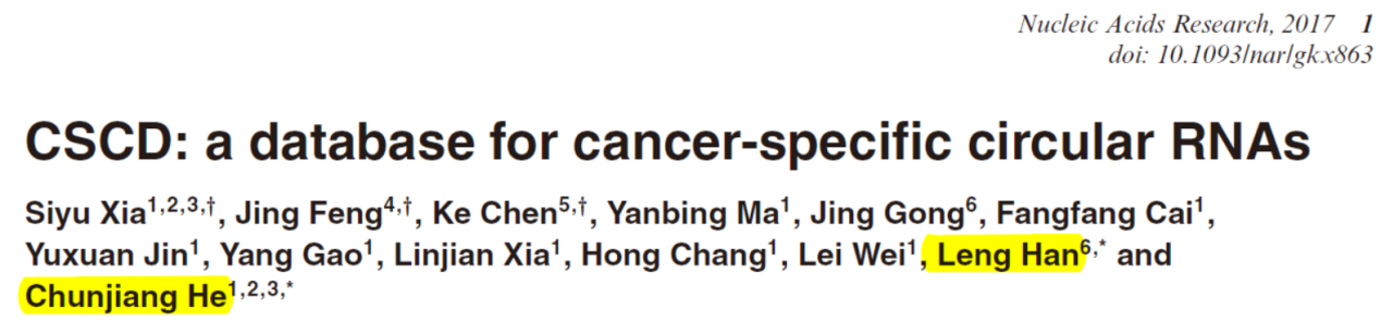 41. Siyu Xia, J.F., Ke Chen, Yanbing Ma, Jing Gong, Fangfang Cai, Yuxuan Jin, Yang Gao, Linjian Xia, Hong Chang, Lei Wei, Leng Han and Chunjiang He, CSCD: a database for cancer-specific circular RNAs. Nucleic Acids Research, 2017.