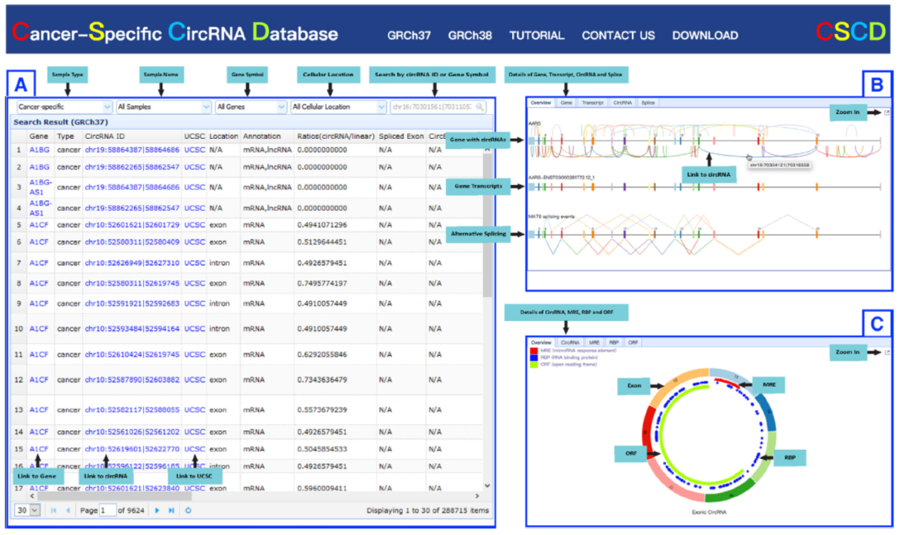 CSCD数据库从ENCODE中收集了19种肿瘤类型的87种细胞系及141种正常细胞的circRNA数据,构建了该数据库。总共汇总得到了272152种肿瘤特异性的circRNAs,950962种正常细胞特异的circRNAs,还有170909种为肿瘤和正常样本共有的。共收集了1394023种circRNA分子,其中外显子来源759039种,内含子来源436668种,基因间序列来源122806种。来自mRNA的1153542种,来lncRNA的42165种。预测到了MRE 76439955个,RNA结合蛋白结合位点103927037个,ORF 3462097个[41]。
