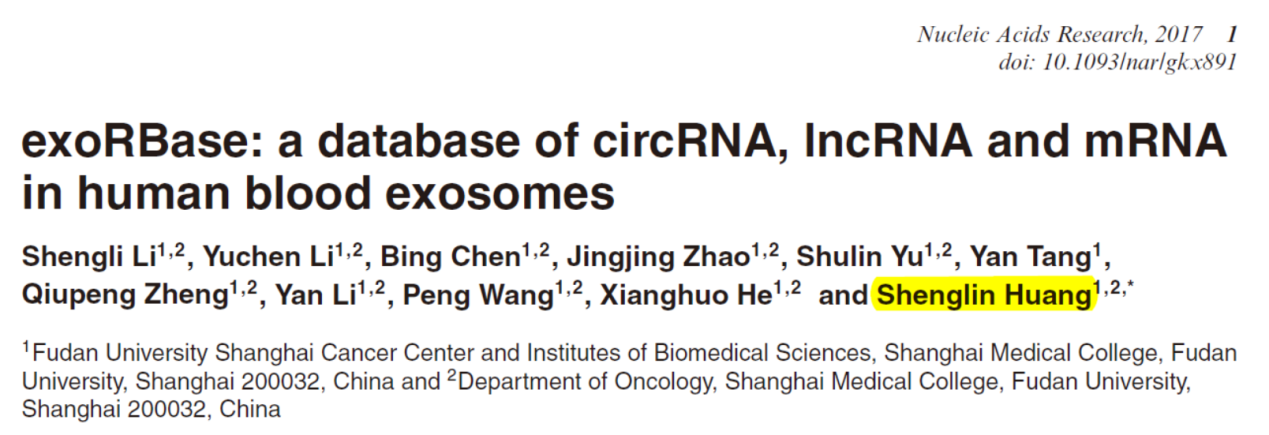 10月9日,Nucleic Acids Research杂志(IF 2016= 10.16)在线发表了复旦大学医学院上海肿瘤研究所黄胜林教授为通讯作者的文章,公布他们开发的专门收录外泌体中各种长链RNA(mRNA, lncRNA及circRNA)的数据库:exoRBase[42]。数据库连接:http://www.exoRBase.org