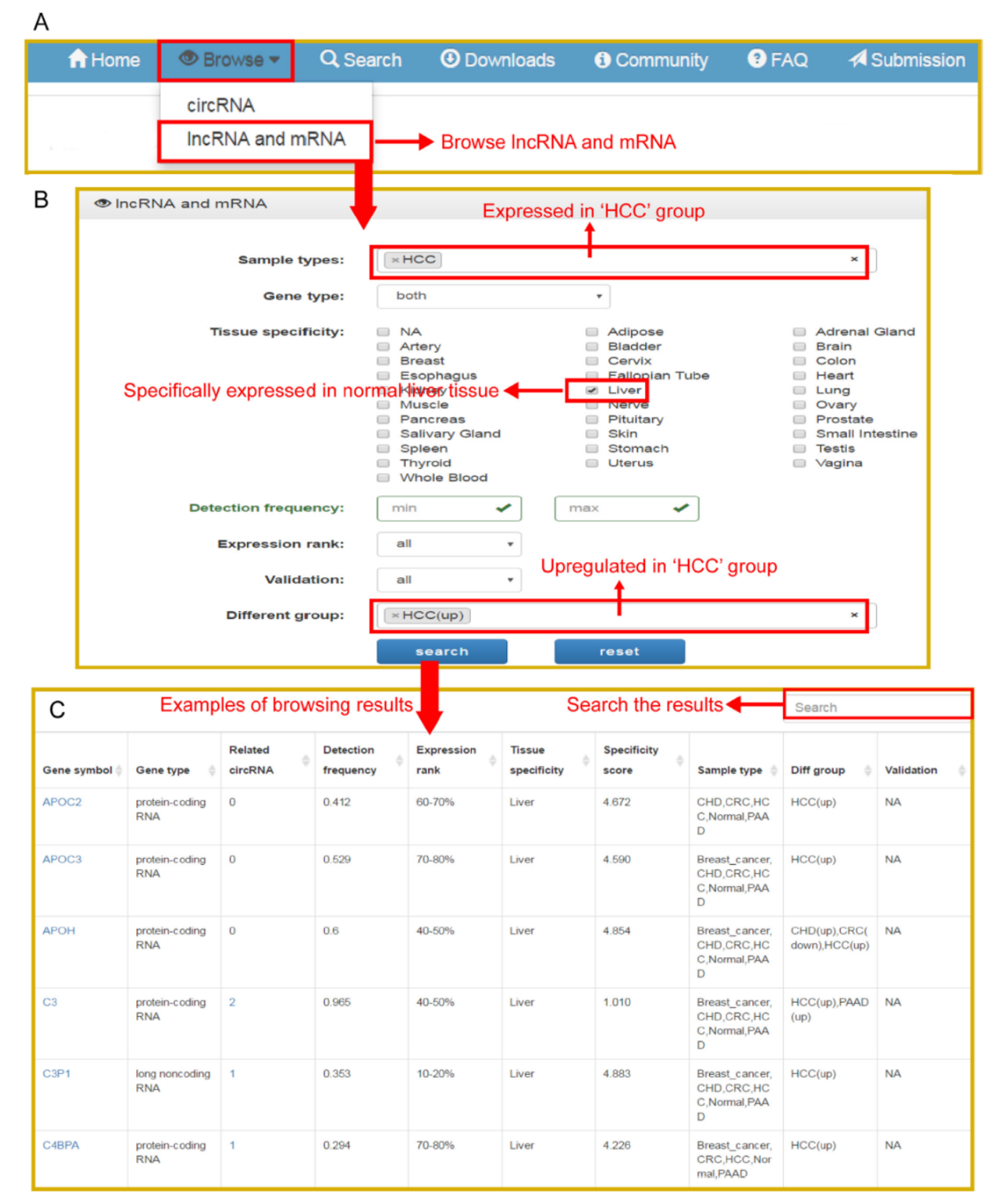 exoRBase数据库共收录了58330种circRNAs,15501种lncRNAs,18333种mRNAs,它们来自92份血清外泌体RNA-seq测序样本。作者还依据GTEx project获得组织特异性RNA表达特征,分析了相关RNA分子的组织来源。数据库收录的样本包括健康对照者32例,冠状动脉心脏疾病(CHD)6例,结肠癌(CRC)12例,肝细胞癌(HCC)21例,胰腺腺癌(PAAD)14例,乳腺癌2例[42]。