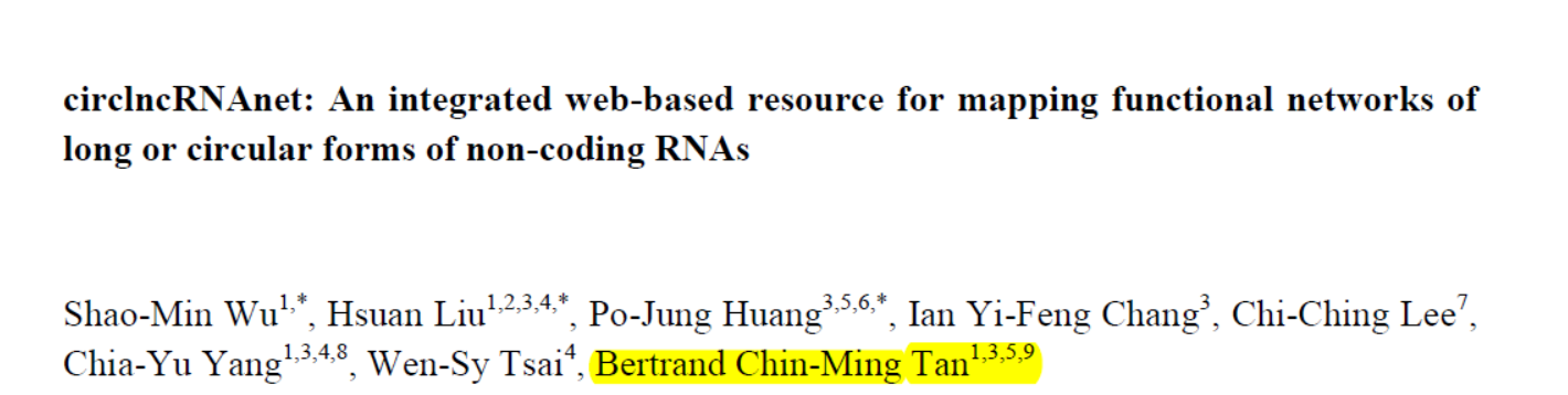 11月29日,Gigascience杂志在线发表了台湾长庚大学医学院Bertrand Chin-Ming Tan为通讯作者的文章,介绍一种整合的circRNA分析数据库:circlncRNAnet[43]。