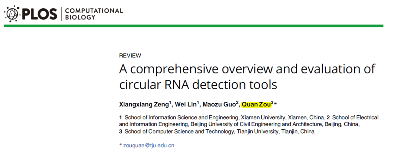 6月8日,PLoS Computational Biology杂志在线发表了天津大学计算机科学与技术学院邹权教授为通讯作者的综述文章,汇总和比较了目前主要的circRNA分析相关技术的优势与不足[44]。