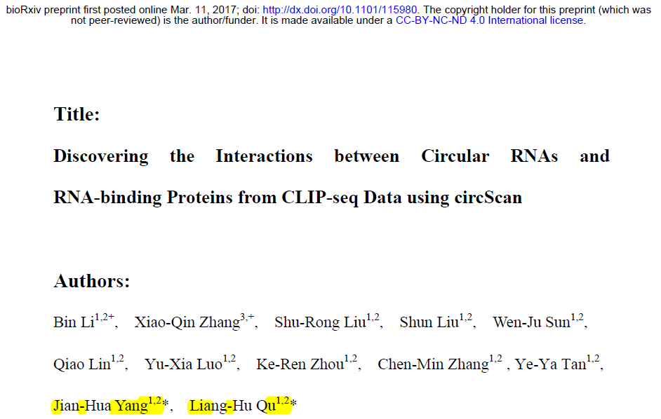 3月11日, 著名预印本杂志BioRxiv在线发表了中山大学屈良鹄教授和杨建华教授为共同通讯作者的文章。介绍利用circScan分析circRNA相互作用蛋白的技术[46]。