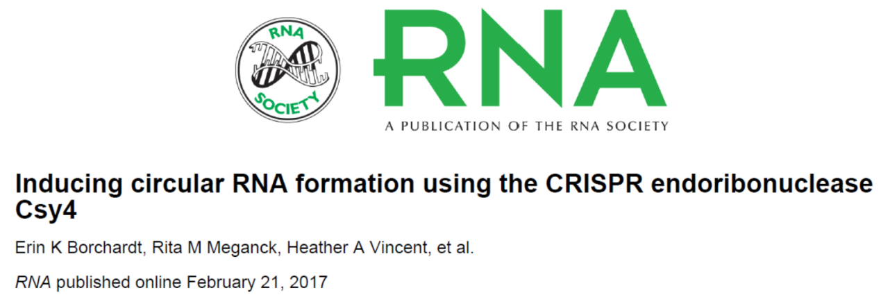 2月21日,RNA杂志在线发表了北卡大学教堂山分校Aravind Asokan教授为通讯作者的文章,介绍开发了一种基于CRISPR同源蛋白Csy4的促进RNA环化的技术[47]。