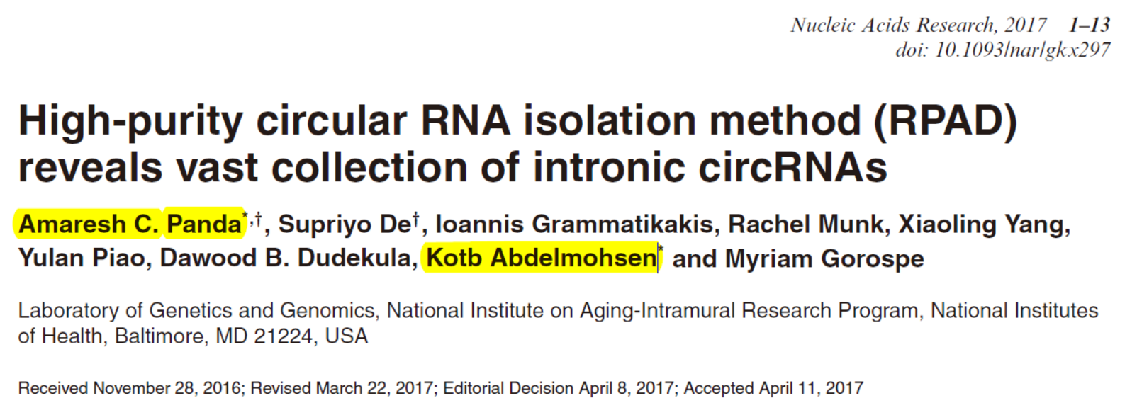 4月11日,Nucleic Acids Research杂志在线发表了NIH 的Amaresh C. Panda和Kotb Abdelmohsen为共同通讯作者的文章,介绍开发了一种提高circRNA获得效率的新技术[48]。