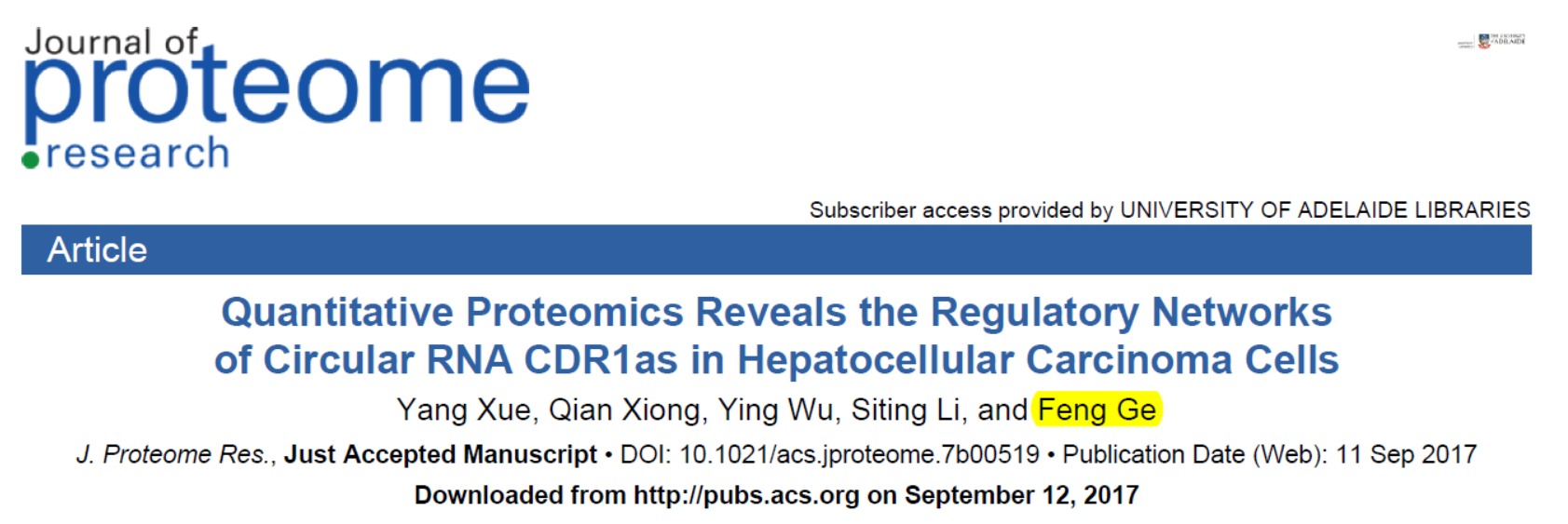 9月11日,Journal of Proteome Research杂志(IF 2016=4.268)在线发表了中科院武汉水生生物所葛峰教授为通讯作者的文章,介绍在HCC细胞系中过表达CDR1as后定量蛋白质组学分析[51]。