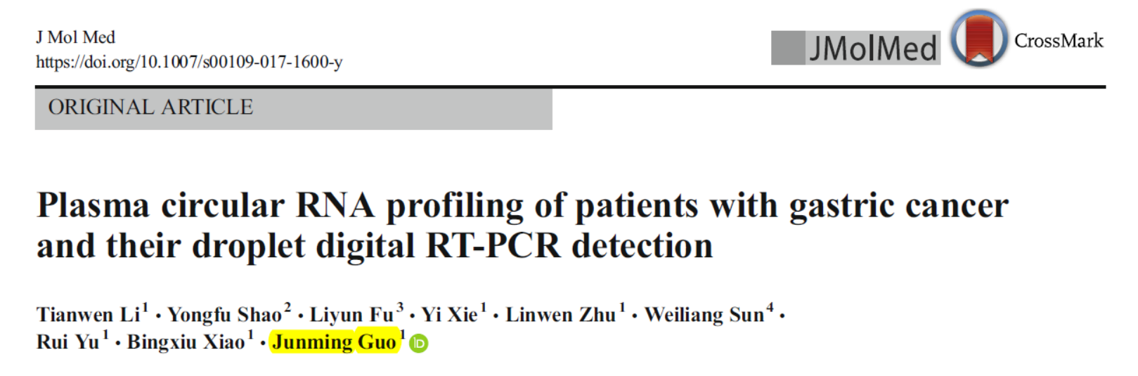 2017年共有两篇文章报道基于微滴式数字PCR进行circRNA绝对定量的分析研究。其中一篇是宁波大学医学院郭俊明教授于11月2日在线发表于Journal of Molecular Medicine杂志的文章,介绍基于微滴式数字PCR分析胃癌血浆中circRNA的测定[53]。