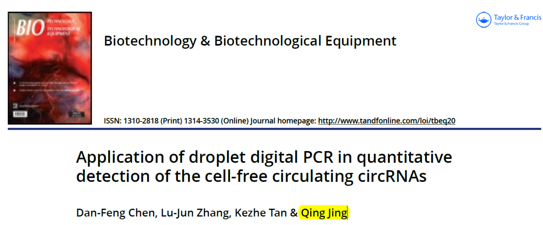 54. Dan-Feng Chen, L.-J.Z., Kezhe Tan & Qing Jing, Application of droplet digital PCR in quantitative detection of the cell-free circulating circRNAs. Biotechnology & Biotechnological Equipment, 2017.