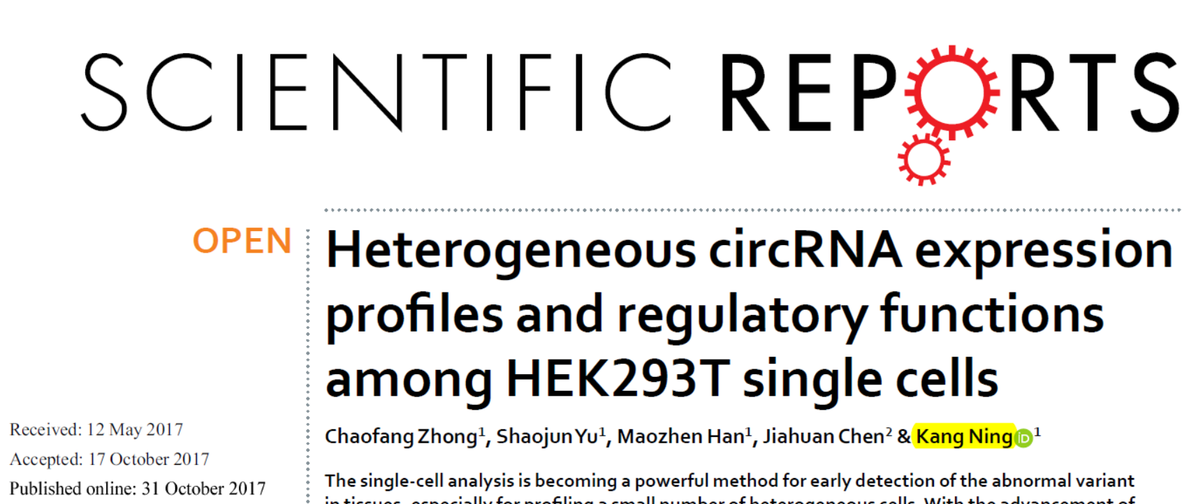 10月31日,Scientific Reports在线发表了华中科技大学宁康为通讯作者的文章,介绍基于单细胞测序,分析了细胞之间circRNA的异质性表达特征[55]。作者利用单细胞测序的方法分析了HEK293不同细胞之间circRNA的表达差异情况,结果表明细胞之间circRNA的表达存在一定程度的异质性。