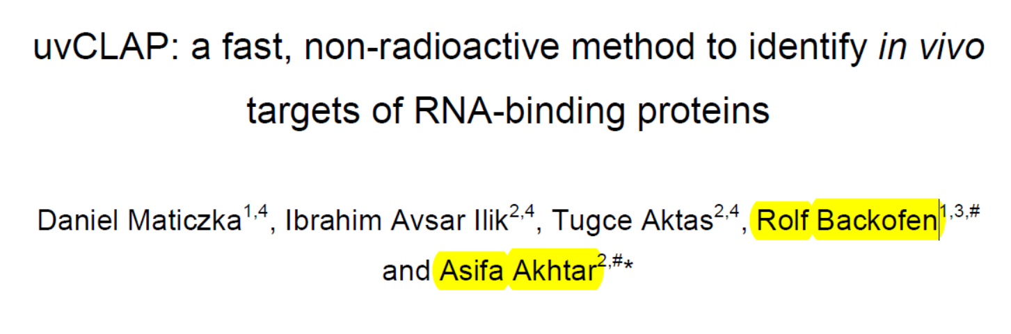 56. Daniel Maticzka, I.A.I., Tugce Aktas, Rolf Backofen and Asifa Akhtar, uvCLAP: a fast, non-radioactive method to identify in vivo targets of RNA-binding proteins. BioRxiv, 2017.