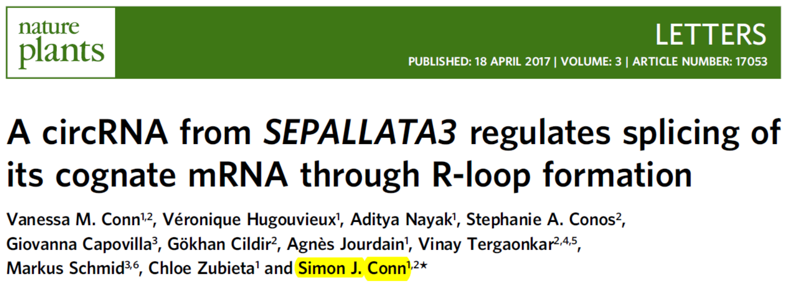 57. Vanessa M. Conn, V.H., Aditya Nayak, Stephanie A. Conos, Giovanna Capovilla, Gökhan Cildir, Agnès Jourdain, Vinay Tergaonkar, Markus Schmid, Chloe Zubieta and Simon J. Conn A circRNA from SEPALLATA3 regulates splicing of its cognate mRNA through R-loop formation. Nature Plants, 2017.