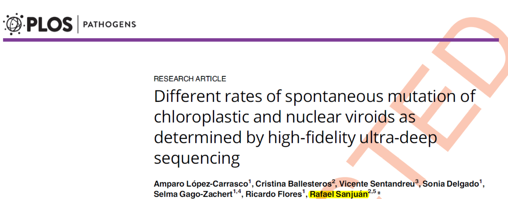 58. Amparo LoÂpez-Carrasco, C.B., Vicente Sentandreu, Sonia Delgado, Selma Gago-Zachert, Ricardo Flores, Rafael SanjuaÂn, Different rates of spontaneous mutation of chloroplastic and nuclear viroids as determined by high-fidelity ultra-deep sequencing. PLoS Pathogens, 2017.