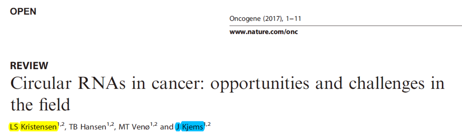 26. Trine Line Hauge Okholm, M.M.N., Mark P. Hamilton, Lise-Lotte Christensen, Søren Vang, Jakob Hedegaard, Thomas Birkballe Hansen, Jørgen Kjems, Lars Dyrskjøt and Jakob Skou Pedersen, Circular RNA expression is abundant and correlated to aggressiveness in early-stage bladder cancer. npj Genomic Medicine, 2017.