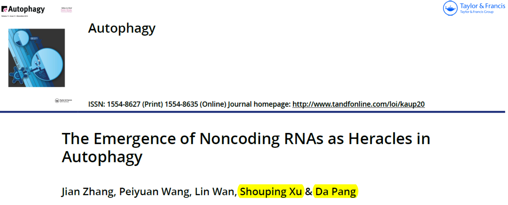 67. Jian Zhang, P.W., Lin Wan, Shouping Xu & Da Pang, The Emergence of Noncoding RNAs as Heracles in Autophagy Autophagy, 2017.