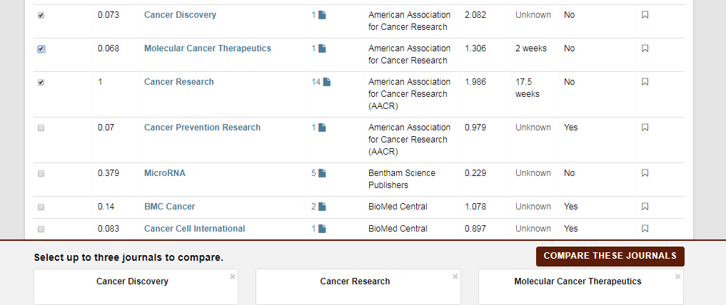 3. 勾选相应的杂志,可进行相关信息(影响因子、出版费、出版速度等)的比较,不过有些信息不提供,有待完善;
