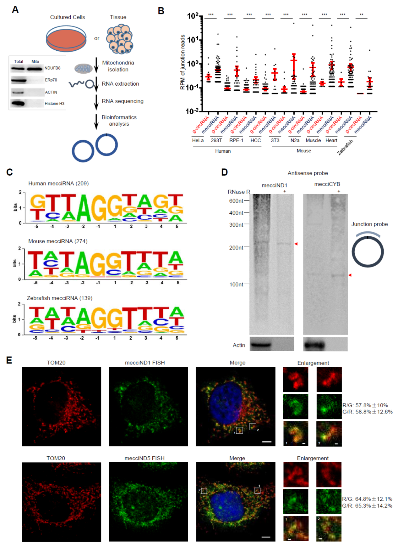 2019年6月12日,生物学预印本杂志BioRxiv发表了中国科学技术大学单革教授的最新研究成果,首次报道人与小鼠线粒体来源的circRNA(mecciRNAs)。mecciRNAs可以通过与TOM40和PNPASE相互作用调控蛋白进入线粒体(参考文献[1])。