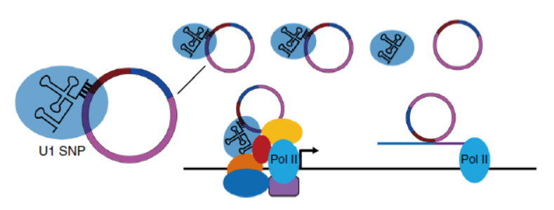 作者通过RNA聚合酶II的CLIP分析发现了这一类特殊的circRNA分子,它们既携带外线子序列,也有一段内含子序列,作者称其为Exon-Intron circular RNA (EIciRNA),功能分析表明EIciRNA倾向于定位于细胞核中,通过与U1 snRNP相互作用,促进这类circRNA的来源基因转录。这一项研究报道是早期circRNA功能研究的重要进展,为circRNA作为蛋白复合物支架的功能模型提供了有力证据。(参考文献[21])