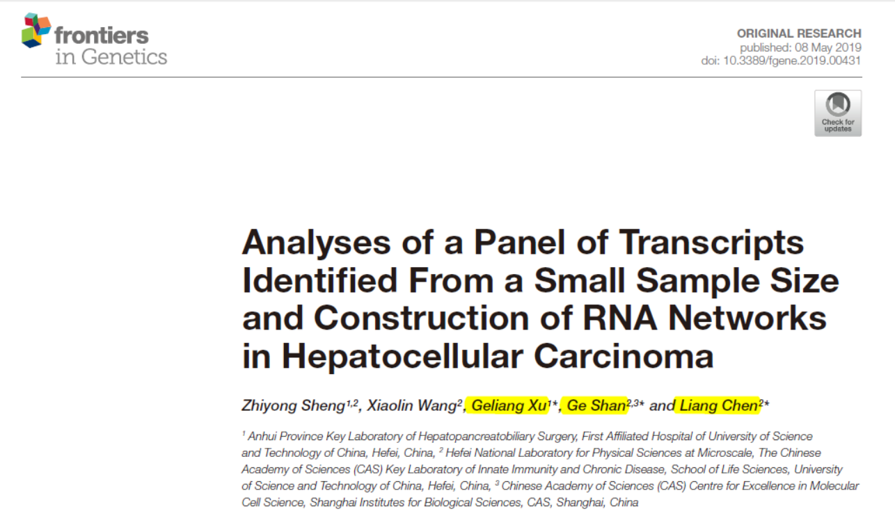 2. Sheng Z, Wang X, Xu G*, Shan G*, Chen L*. Analyses of a Panel of Transcripts Identified from a Small Sample Size and Construction of RNA Networks in Hepatocellular Carcinoma. Front Genet. 2019 May 8;10:431. doi: 10.3389/fgene.2019.00431