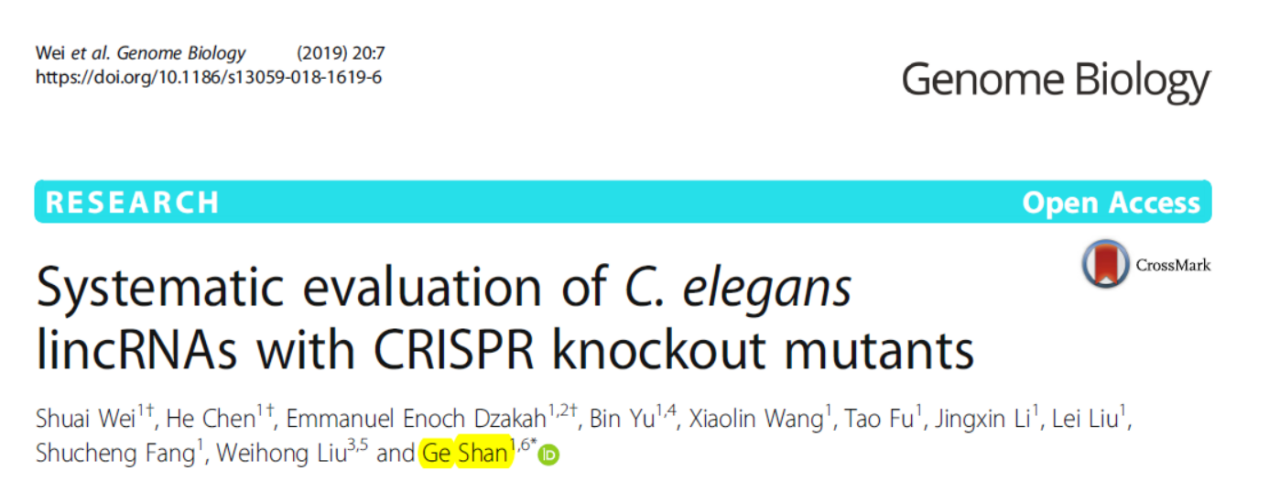 3. Wei S, Chen H, Dzakah EE, Yu B, Wang X, Fu T, Li J, Liu L, Fang S, Liu W, Shan G*. Systematic evaluation of C. elegans lincRNAs with CRISPR knockout mutants. Genome Biol. 2019 Jan 8;20(1):7. doi: 10.1186/s13059-018-1619-6