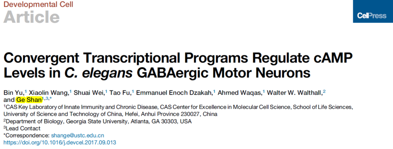 8. Yu B, Wang X, Wei S, Fu T, Dzakah EE, Waqas A, Walthall WW, Shan G*. Convergent Transcriptional Programs Regulate cAMP Levels in C. elegans GABAergic Motor Neurons. Dev Cell. 2017 Oct 23;43(2):212-226.e7. doi: 10.1016/j.devcel.2017.09.013