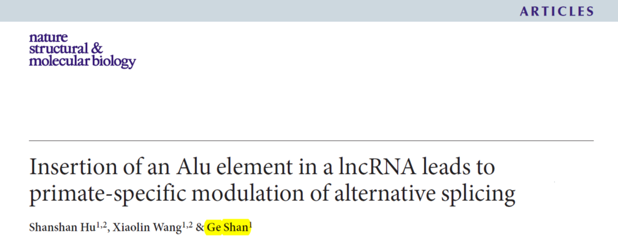 13. Hu S, Wang X, Shan G*. Insertion of an Alu element in a lncRNA leads to primate-specific modulation of alternative splicing. Nat Struct Mol Biol. 2016 Nov;23(11):1011-1019. doi: 10.1038/nsmb.3302.