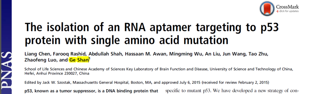 20. Liang Chen, Farooq Rashid, Abdullah Shah, Hassaan M. Awan, Mingming Wu, An Liu, Jun Wang, Tao Zhu, Zhaofeng Luo, Ge Shan*. The isolation of an RNA aptamer targeting to p53 protein with single amino acid mutation. P.N.A.S. 2015, 112(32):10002-10007.