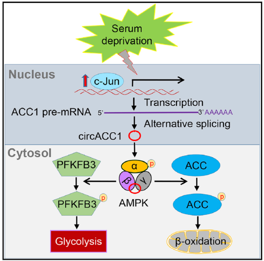 本文先从筛选脂代谢相关基因来源的circRNA是否与脂代谢相关入手,找到了circACC1分子,然后进一步确认了circACC1与脂代谢的相关性,进一步分析了ACC1,AMPK等代谢酶和调控基因的表达和磷酸化状态和表达水平,发现了干扰circACC1能够降低ACC1,FPKFB3的磷酸化水平,同时也降低AMPK磷酸化水平及亚基的丰度。这些发现暗示了circACC1可能与AMPK的功能有关系,相互作用分析确认了circACC1与AMPK的β和γ亚基可直接相互作用,突变分析找出了它们相互作用的区段。基于蛋白稳定性的分析发现了circACC1与AMPK的相互作用能够促进AMPK的稳定性,也同时参与维持AMPK基础活性。作者还发现了血清饥饿可通过c-Jun激活circACC1的表达。最后肿瘤学功能分析表明circACC1具有促进肿瘤生长的作用,病人标本中也存在较高比例的circACC1高表达情况。(参考文献[1])