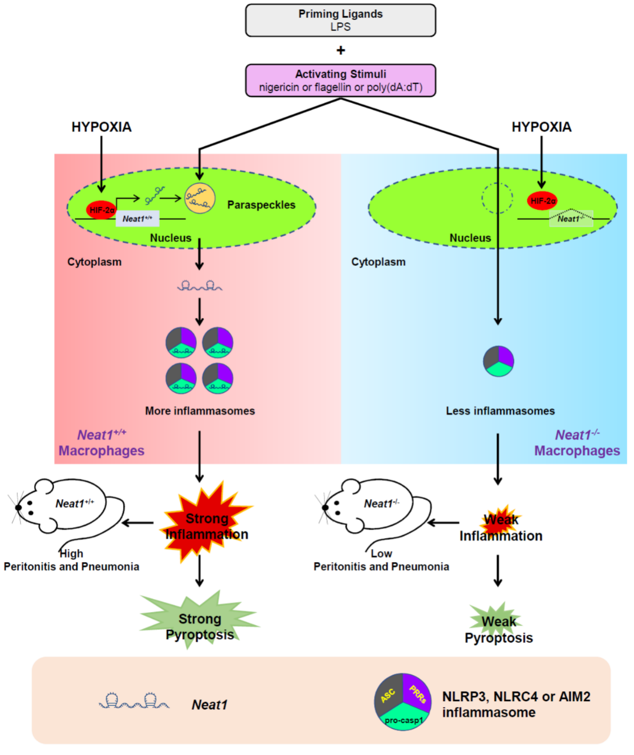 作者通过紫外交联捕获的方法,通过NLRP3的抗体捕获了相互作用的分子,基于高通量测序分析得到了若干非编码RNA分子,其中就有Neat1。功能分析发现干扰Neat1可显著降低LPS诱导的NLRP3的激活,表现为抑制Caspase-1的激活和IL-1β生成量下降。除了NLRP3,作者发现Neat1还可以激活NLRC4 和AIM2。正常状态下,Neat1处于细胞核中的paraspeckles结构中。当遇到炎症刺激信号后,Neat1释放至细胞质中,促进炎症小体(包括NLRP3,NLRC4 或AIM2等等)与Caspase-1的结合,激活Caspase-1,促进下游IL-1β等的生成,诱发炎症反应。在Neat1敲除的小鼠中,炎症刺激信号诱发的验证效应显著下降,也证明了上述通路。除了炎症刺激信号,低氧也可以诱导Neat1的表达,HIF-2α介导Neat1的表达。(参考文献[2])